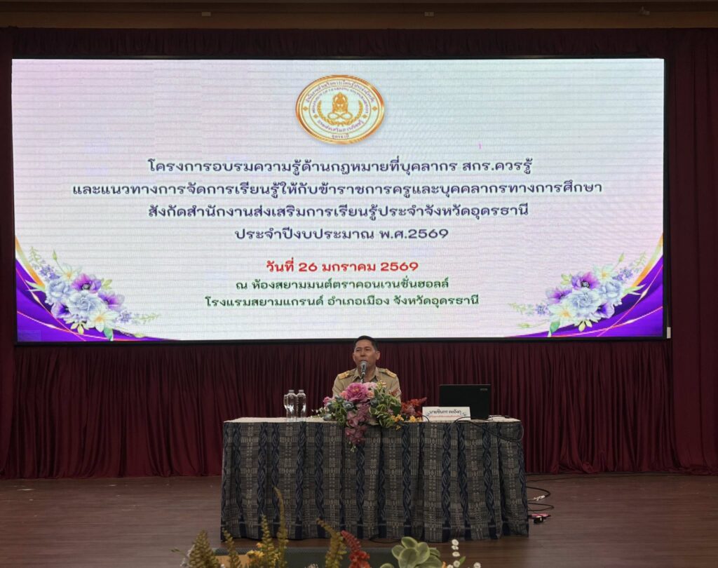 วันที่ 26 มกราคม 2569 ณ ห้องประชุมสยามมนตรา โรงแรมสยามแกรนด์ อำเภอเมืองอุดรธานี จังหวัดอุดรธานี สำนักงานส่งเสริมการเรียนรู้ประจำจังหวัดอุดรธานี จัดพิธีเปิดโครงการอบรมความรู้ด้านกฎหมายที่บุคลากร สกร.ควรรู้และแนวทางการจัดการเรียนรู้ ให้แก่ข้าราชการครูและบุคลากรทางการศึกษาในสังกัด โดยมี นายชินกร คะอังกุ ผู้อำนวยการสำนักงานส่งเสริมการเรียนรู้ประจำจังหวัดอุดรธานี เป็นประธานเปิดโครงการฯ และได้รับเกียรติจาก ดร. จักรกริช บุญเดช นักกฎหมายอิสระ และ ดร.เพ็ญศรี บุญเดช ศึกษานิเทศก์เชี่ยวชาญ เป็นวิทยากรบรรยาย ให้ความรู้แก่ผู้เข้าอบรมในครั้งนี้