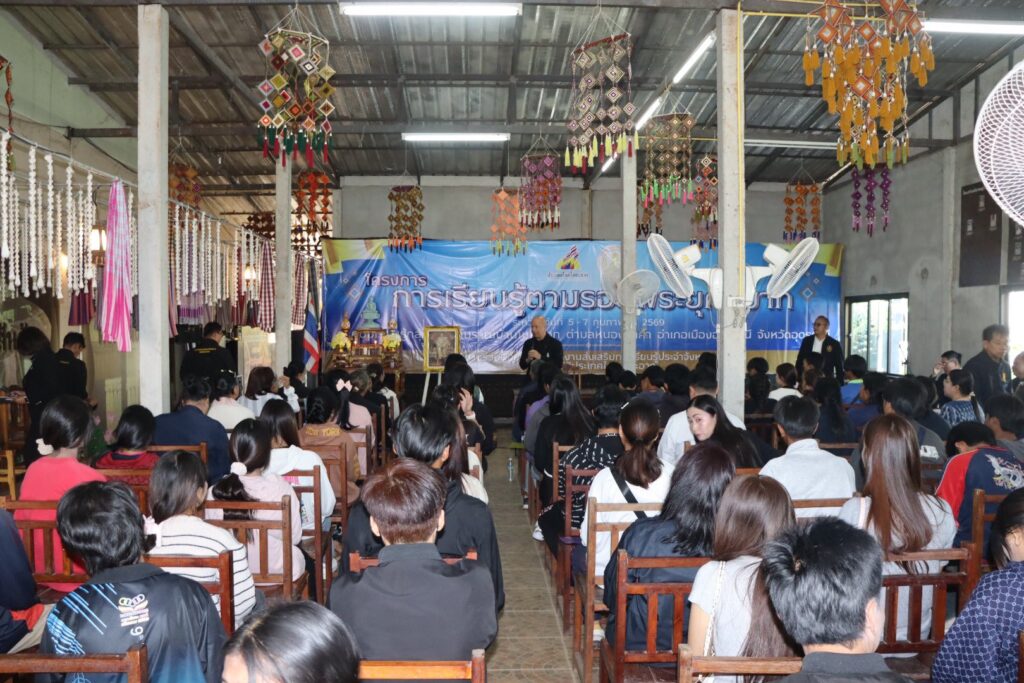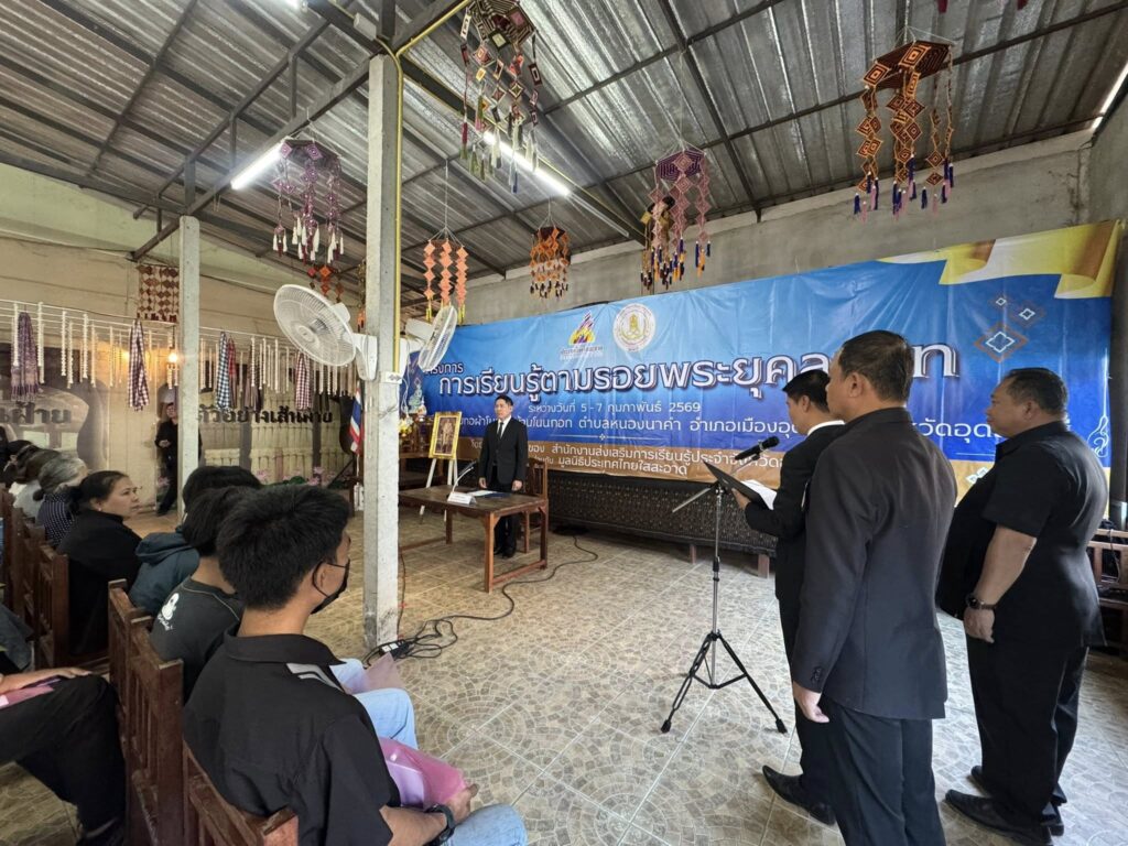 นายชินกร คะอังกุ ผู้อำนวยการสำนักงานส่งเสริมการเรียนรู้ประจำจังหวัดอุดรธานี เป็นประธานในพิธีเปิดโครงการการเรียนรู้ตามรอยพระยุคลบาท เฟส 2 ณ ศูนย์เรียนรู้กลุ่มทอผ้าโบราณบ้านโนนกอก ตำบลหนองนาคำ อำเภอเมืองอุดรธานี จังหวัดอุดรธานี โดยมีนายภาสกร เมิดจันทึก รองผู้อำนวยการสำนักงานส่งเสริมการเรียนรู้ประจำจังหวัดอุดรธานี เป็นผู้กล่าวรายงานวัตถุประสงค์การจัดโครงการฯ โครงการดังกล่าวจัดขึ้นระหว่างวันที่ 5 – 7 กุมภาพันธ์ พ.ศ. 2569 มีผู้บริหาร ครู บุคลากร และนักศึกษาในสังกัด สำนักงานส่งเสริมการเรียนรู้ประจำจังหวัดอุดรธานี เข้าร่วมกิจกรรมจำนวน 110 คน โดยมีวัตถุประสงค์ เพื่อสร้างความตระหนักรู้ในเรื่องคุณธรรมจริยธรรม ความซื่อสัตย์สุจริต การเป็นพลเมืองที่ดีและตระหนักถึงพระมหากรุณาที่คุณและคุณูปการของสถาบันพระมหากษัตริย์ เพื่อนำองค์กรความรู้ไปพัฒนาทักษะชีวิตให้เป็น “พลเมืองที่ดี มีคุณธรรม และเทิดทูนสถาบันพระมหากษัตริย์” พร้อมเป็นพลังสำคัญในการสร้างสังคมไทยให้น่าอยู่ เพื่อเสริมสร้างความรู้ กระบวนการเรียนรู้ และหลักการทรงงานของในหลวงรัชกาลที่ 9 และรัชกาลที่ 10 สามารถนำมาประยุกต์ต่อยอดและถ่ายทอดได้ นำหลักทศพิธราชธรรม เป็นกรอบแนวทางในการปฏิบัติตน